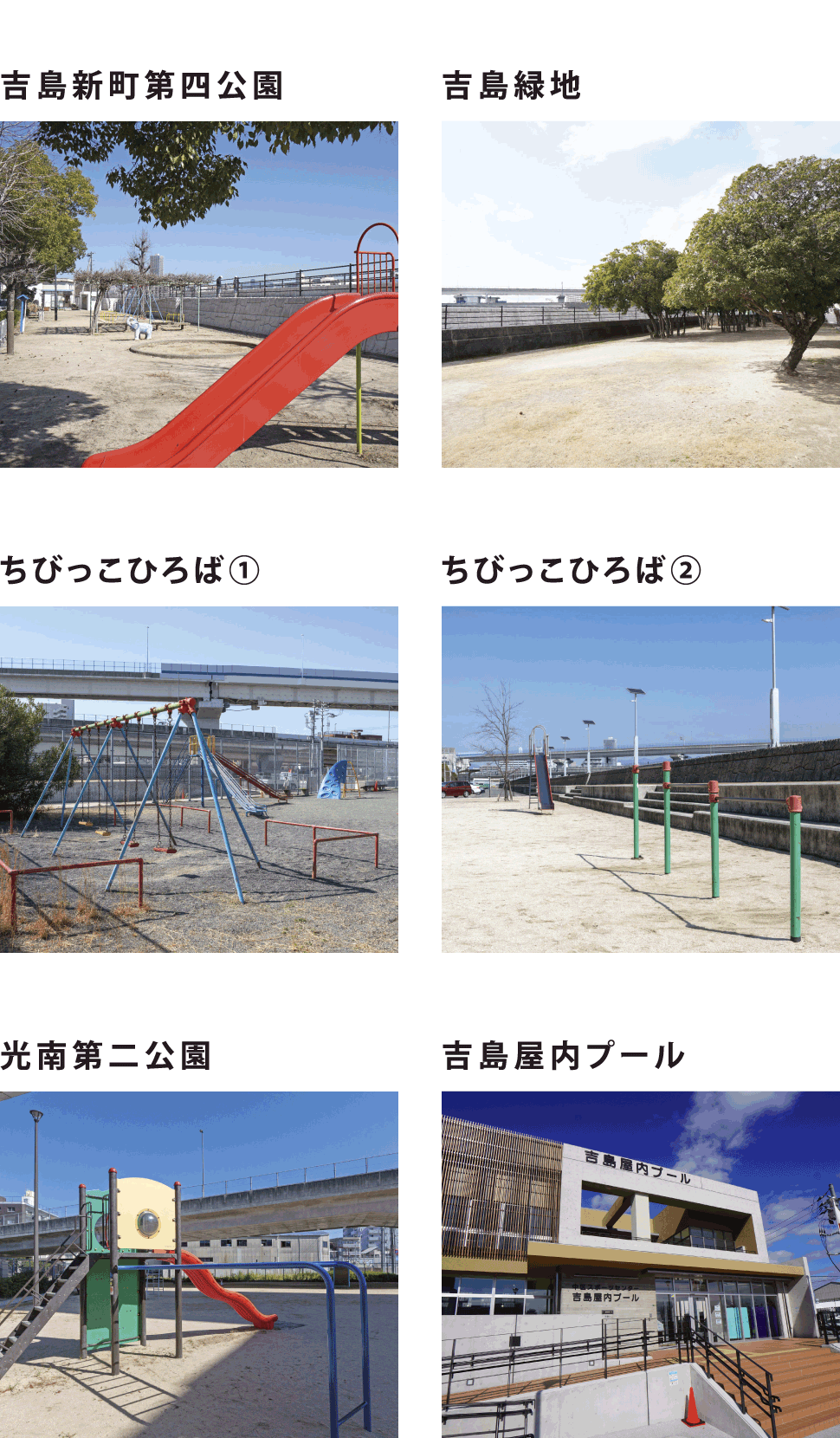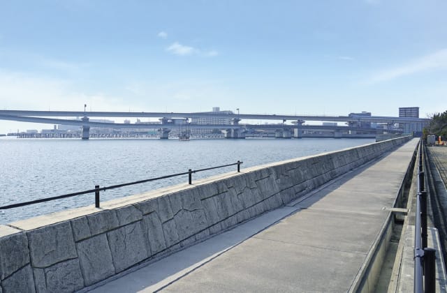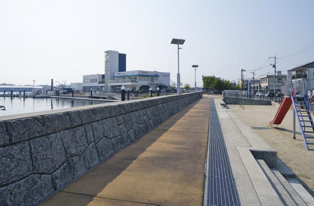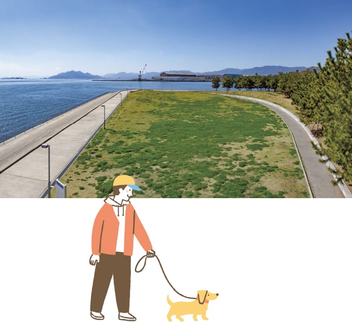 「ヴェルディ・コーストテラス[吉島]」から、遊歩道を利用すれば、道路に出ることなく安全に「吉島釣り公園」までノンストップで行くことができます。美しい水辺を眺めながら、ウォーキングを楽しんだり、ペットのお散歩にも最適。整備された遊歩道沿いには遊具のある公園が多数。いつも身近に水と緑を感じる事ができる住環境です。