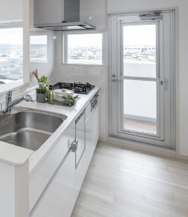 キッチンからバルコニーへの動線が生まれ、生ゴミ等の一時保管も可能に。換気にも便利に使え、ガラスドアやキッチン横に設けた小窓は採光性を高めてくれます。